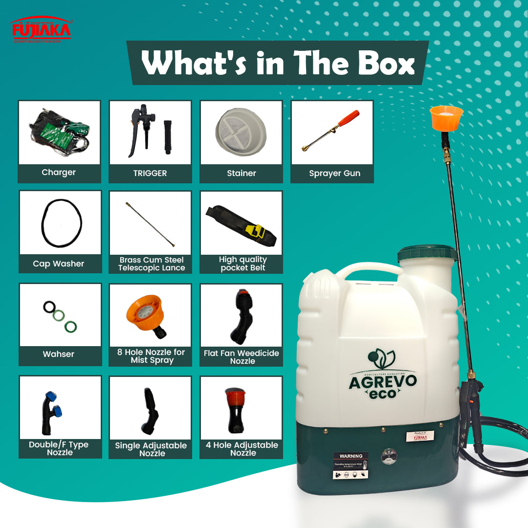 - Package Include 1. ECO Sprayer with Spares Packet 2. 4 types of nozzles, 3. Charging Adaptor, 4. User Manual