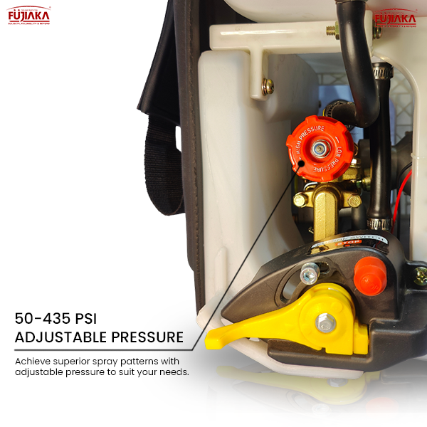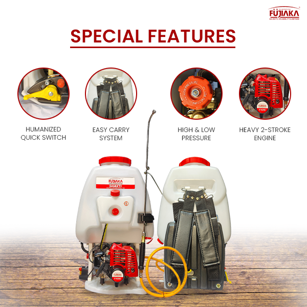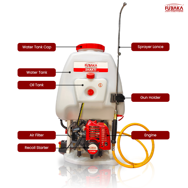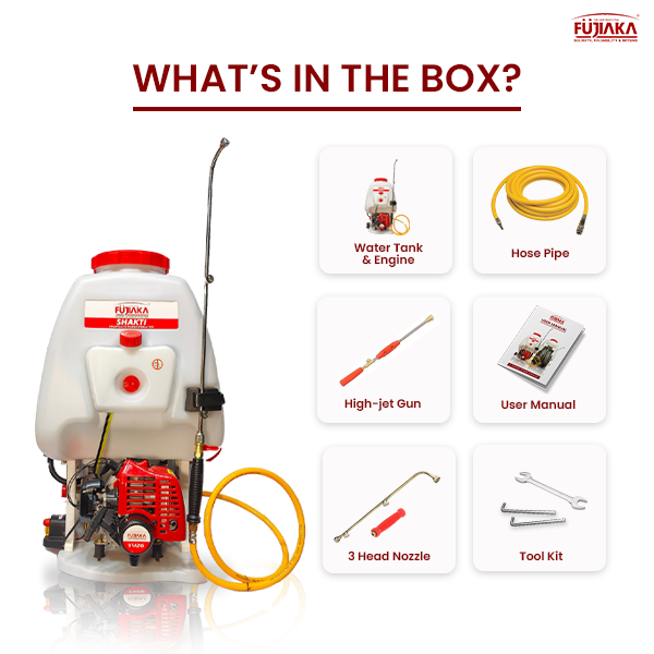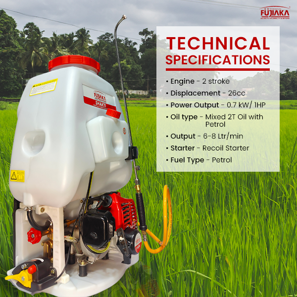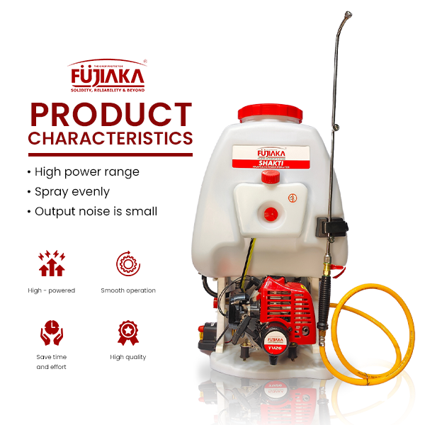 The Fujiaka SHAKTI 25 Litre backpack power sprayer is an ideal engine sprayer for spraying costly pesticides. If you are a farmer or own a farm, nursery, tea garden. mangrove and other large-scale farming land, then this machine has the right balance of tank capacity and reach. Our SHAKTI sprayer comes with an efficient Two-Stroke 26cc Petrol Engine with an Easy-Starter which can run for up to 60 minutes with 1 Litre of Petrol.